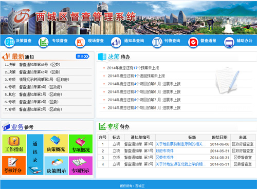 根據信息化的發展規律,結合西城區(qū)的實際,我司為(wèi)西城區(qū)信息中心建設指揮督辦及任務管理(lǐ)系統,實現領導指揮任務督辦,任務全流程跟蹤辦理(lǐ)。結合國內(nèi)外先進管理(lǐ)經驗,結合西城實際需求,研究不同類别指揮督辦及任務管理(lǐ)項目的管理(lǐ)方法和(hé)策略,構建符合西城實際的指揮督辦及任務管理(lǐ)規範,研究相關指揮督辦及任務管理(lǐ)建設及運維規範,建立相關制(zhì)度。開(kāi)發統一标準接口與其他業務系統對接,減少(shǎo)工作(zuò)中不必要的時(shí)效浪費,提高(gāo)工作(zuò)效率。